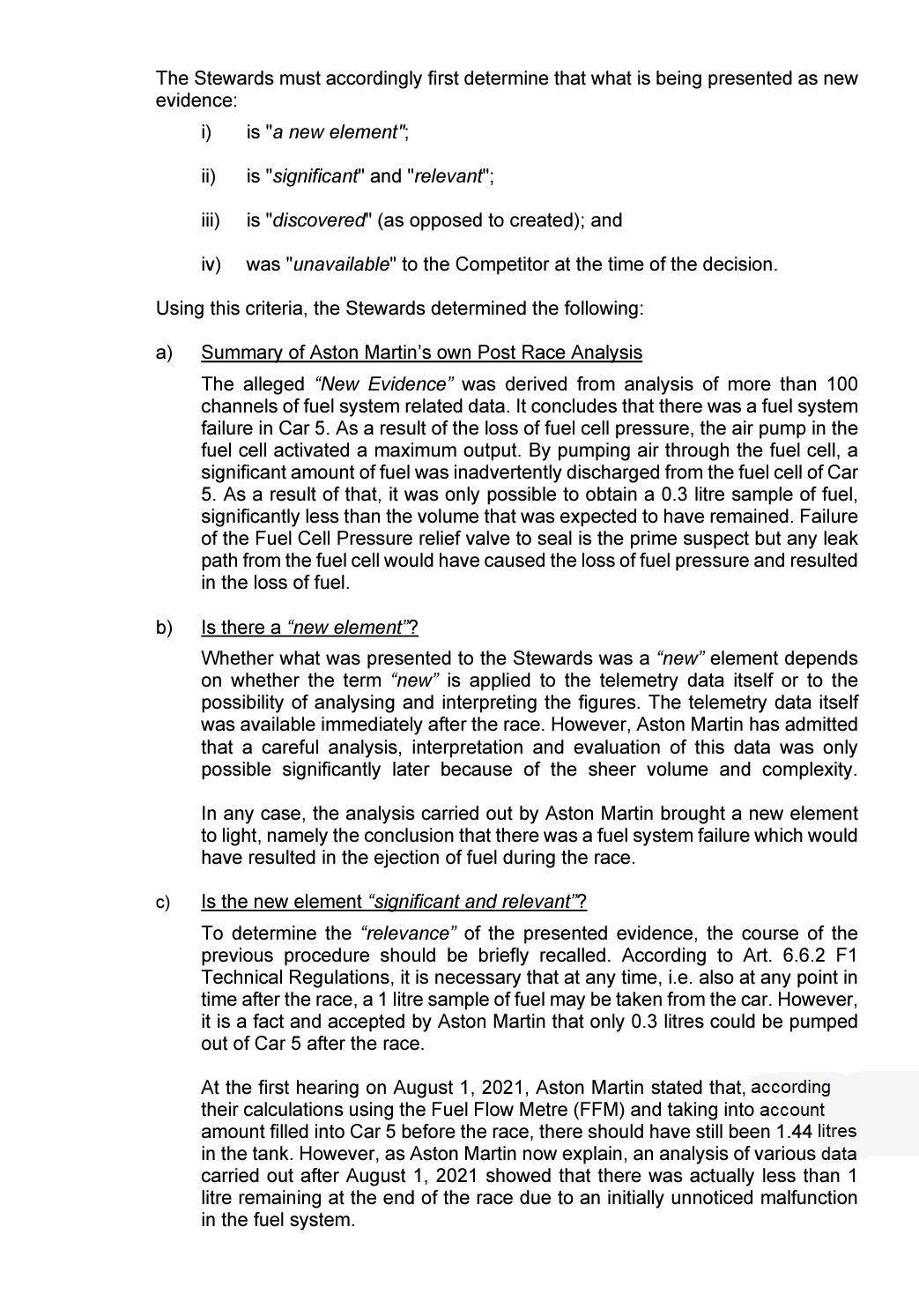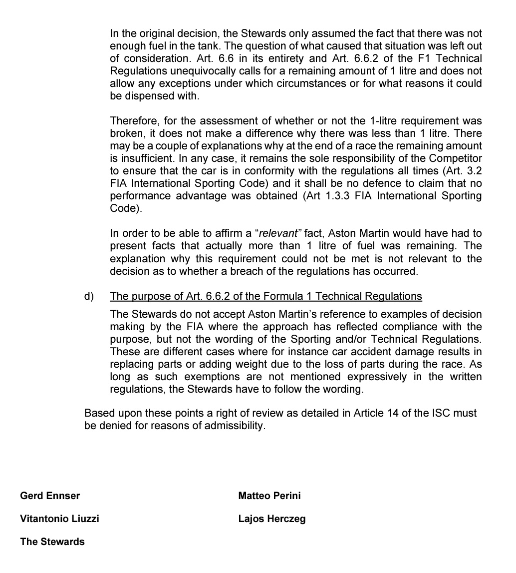 Pero los comisarios rechazaron las evidencias presentadas por Aston Martin. Aunque se comprobó el problema del monoplaza; esto no sería del todo relevante. Remarcando además, que las regulaciones no permiten excepciones y que el equipo debe ser responsable de tener el coche en regla.