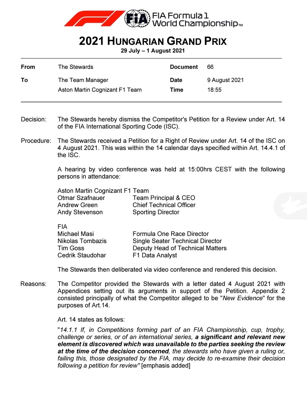 Luego de días de suspenso, los comisarios finalmente rechazaron la petición de Aston Martin para revertir la descalificación de Sebastian Vettel en el Gran Premio de Hungría. El alemán había terminado 2°, luego de batallar por la victoria contra Esteban Ocon; pero la FIA no pudo extraer la cantidad mínima requerida de combustible y fue excluido de la prueba.