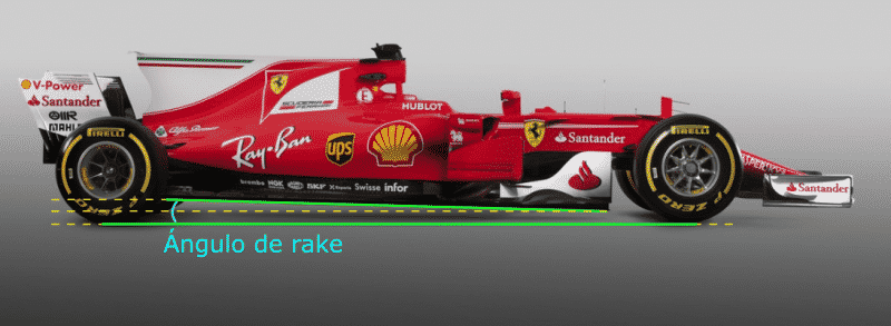 Fue Adrian Newey el que inventó el Rake para Red Bull, y hoy en día todos han sabido adaptarlo a sus monoplazas para aprovechar sus beneficios. El concepto consiste en dar un ángulo al fondo plano del coche respecto al asfalto. Es decir, que haya una cierta inclinación, con la parte trasera más alta que la delantera, disminuyendo así la resistencia aerodinámica del coche.