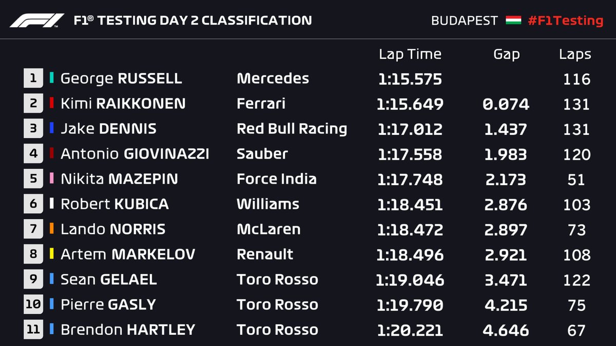 De allí para el final, poca actividad había en pista. Con eso, Russell se quedó como el más rápido de las pruebas en Hungaroring, mientras que Raikkonen fue el segundo. Dennis, Giovinazzi y Mazepin cerraron el rol de los cinco más veloces.