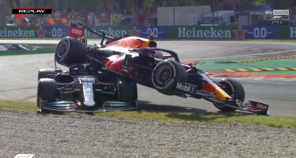 Según un comunicado emitido por la FIA horas después del GP de Italia, “el coche nº 44 [Hamilton] salía de boxes. El auto 33 [Verstappen] estaba en la recta principal. 50 metros antes de la curva 1, el auto 44 estaba significativamente por delante del 33, que pisó los frenos más tarde y se puso al lado del 44, pero nunca se adelantó. El conductor del automóvil n. ° 33 afirmó que fue culpa del n. ° 44, que abrió el volante en la curva 1 y lo apretó en la curva 2. El conductor del automóvil n. ° 44 dijo que el conductor del automóvil n. ° 33 intentó adelantar demasiado tarde y debería haberlo hecho. abandonado en la curva “.
