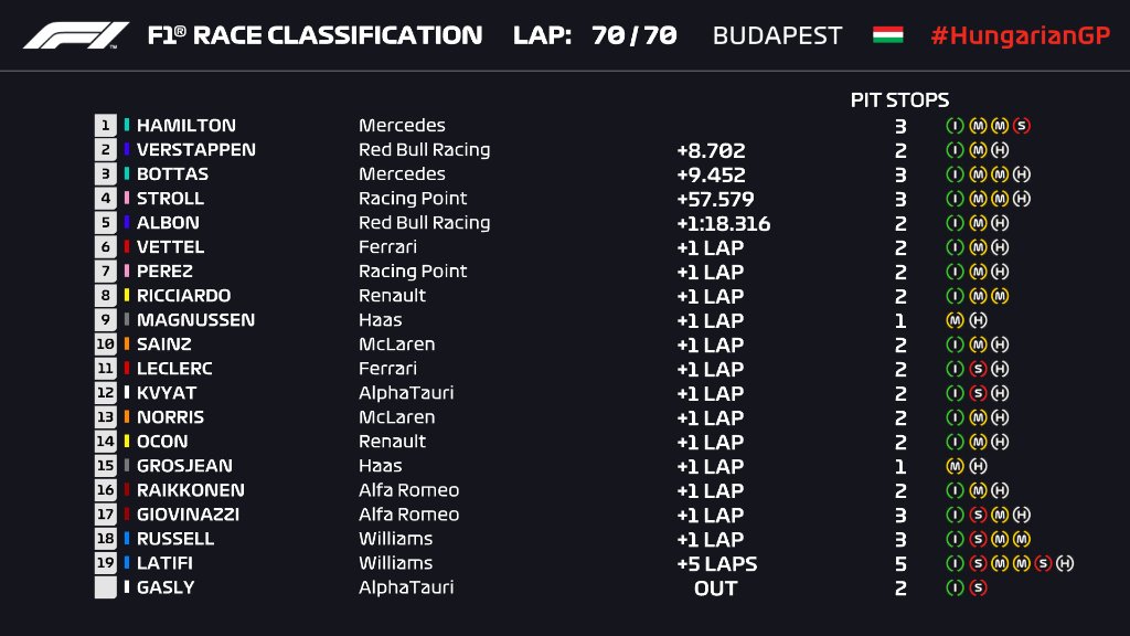 Lance Stroll obtuvo un gran cuarto lugar para Racing Point , seguido por Alexander Albon, también de Red Bull, quien salió del 13 ° lugar en la parrilla por el quinto lugar. El tailandés dejó atrás al Ferrari de Sebastian Vettel, mientras que Sergio Pérez, que comenzó en cuarto, cruzó la línea de meta en séptimo.