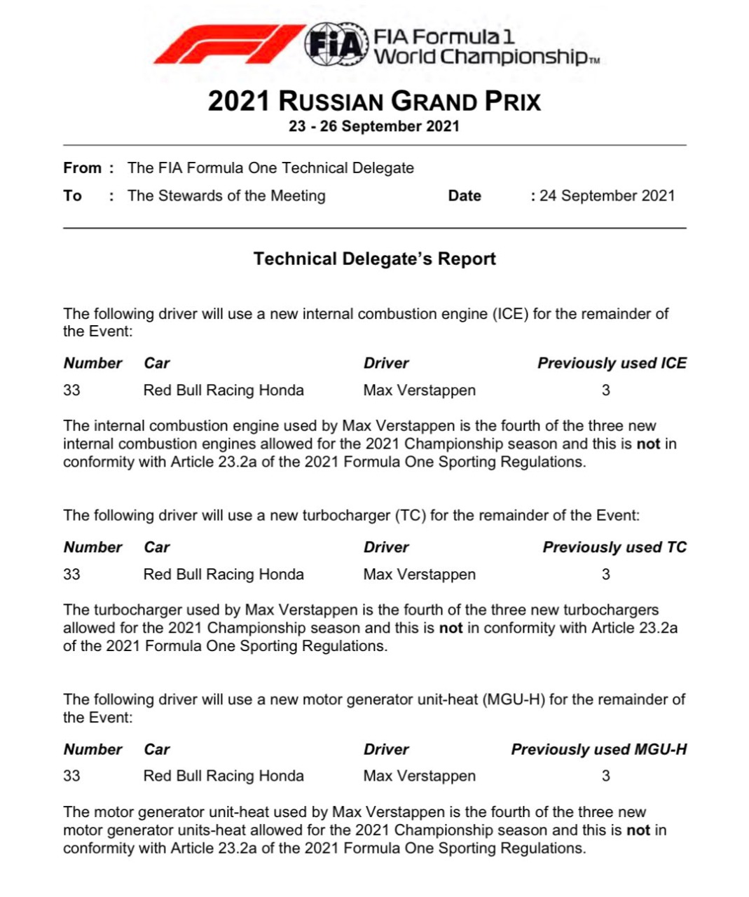 Se ha confirmado, durante la segunda sesión de entrenamientos del Gran Premio de Rusia, que Max Verstappen (Red Bull) realizará cambios en diferentes partes de su Rb16B. En la misma situación se encuentra Charles Leclerc (Ferrari), quien lo escoltará en el fondo de la parrilla para la largada del GP.