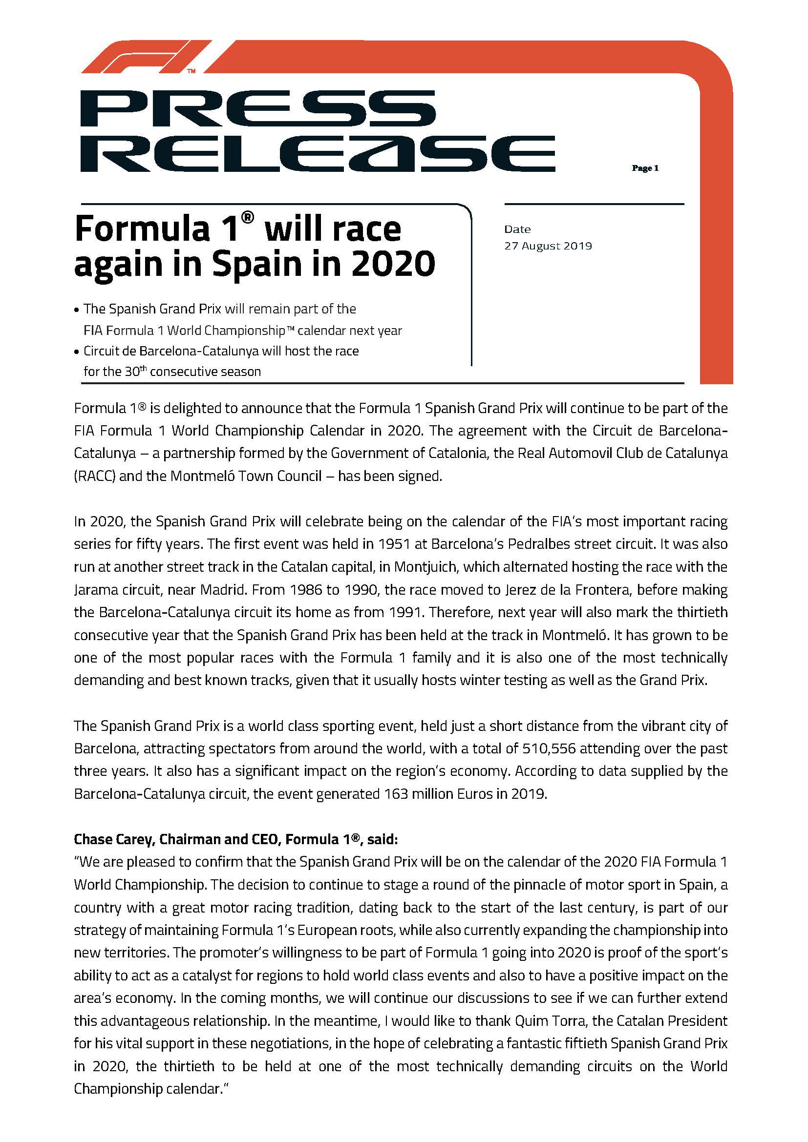 “Cataluña será la anfitriona de un GP de Fórmula 1 por trigésima vez consecutiva. Cataluña es un país con una gran tradición en el automovilismo y nos complace fortalecer y mantener nuestro clásico evento de fanáticos. En el transcurso de estos 30 años, hemos integrado este evento con las políticas industriales del gobierno, y el GP de Fórmula 1 en el Circuito Barcelona-Catalunya es una herramienta importante para estimular la actividad económica en el país en términos de turismo y entretenimiento. Además, tenemos la oportunidad de mostrarle al mundo cómo somos los catalanes, cómo trabajamos y cómo es el país. Por todas estas razones, damos la bienvenida a la continuación de la Fórmula 1 en nuestro país de origen “, dijo Quim Torra, presidente de Cataluña. .