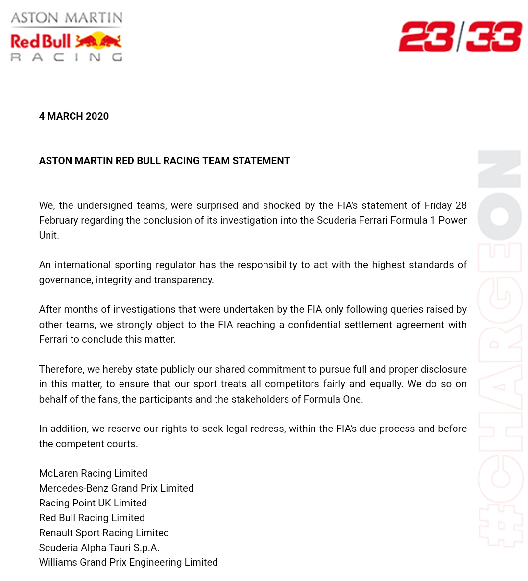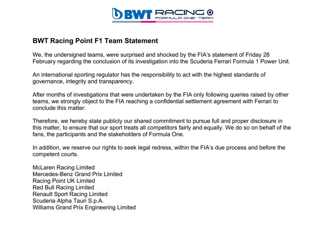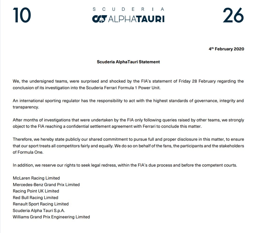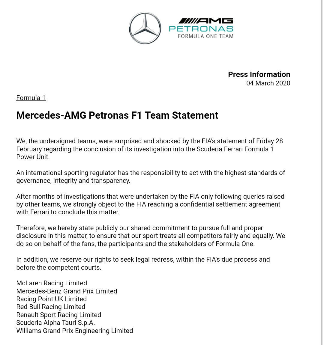 En una petición emitida el miércoles por la mañana, McLaren, Mercedes, Racing Point, AlphaTauri, Renault, Red Bull y Williams emitieron una declaración repudiando a la FIA por el acuerdo confidencial hecho entre FIA y Ferrari con respecto a la unidad de potencia del equipo italiano en 2019. Solo Ferrari y los clientes Haas y Alfa Romeo no firmaron la declaración.